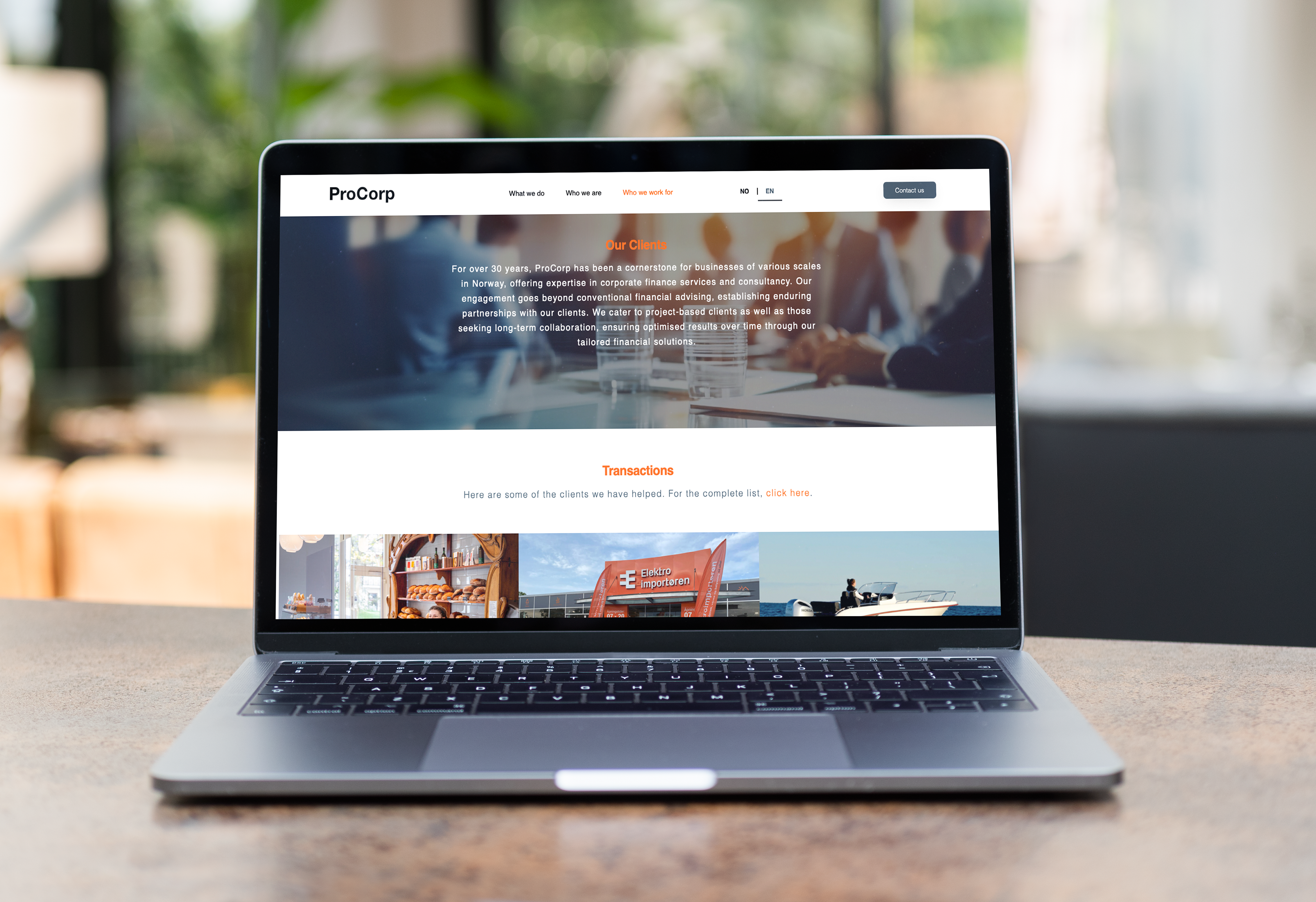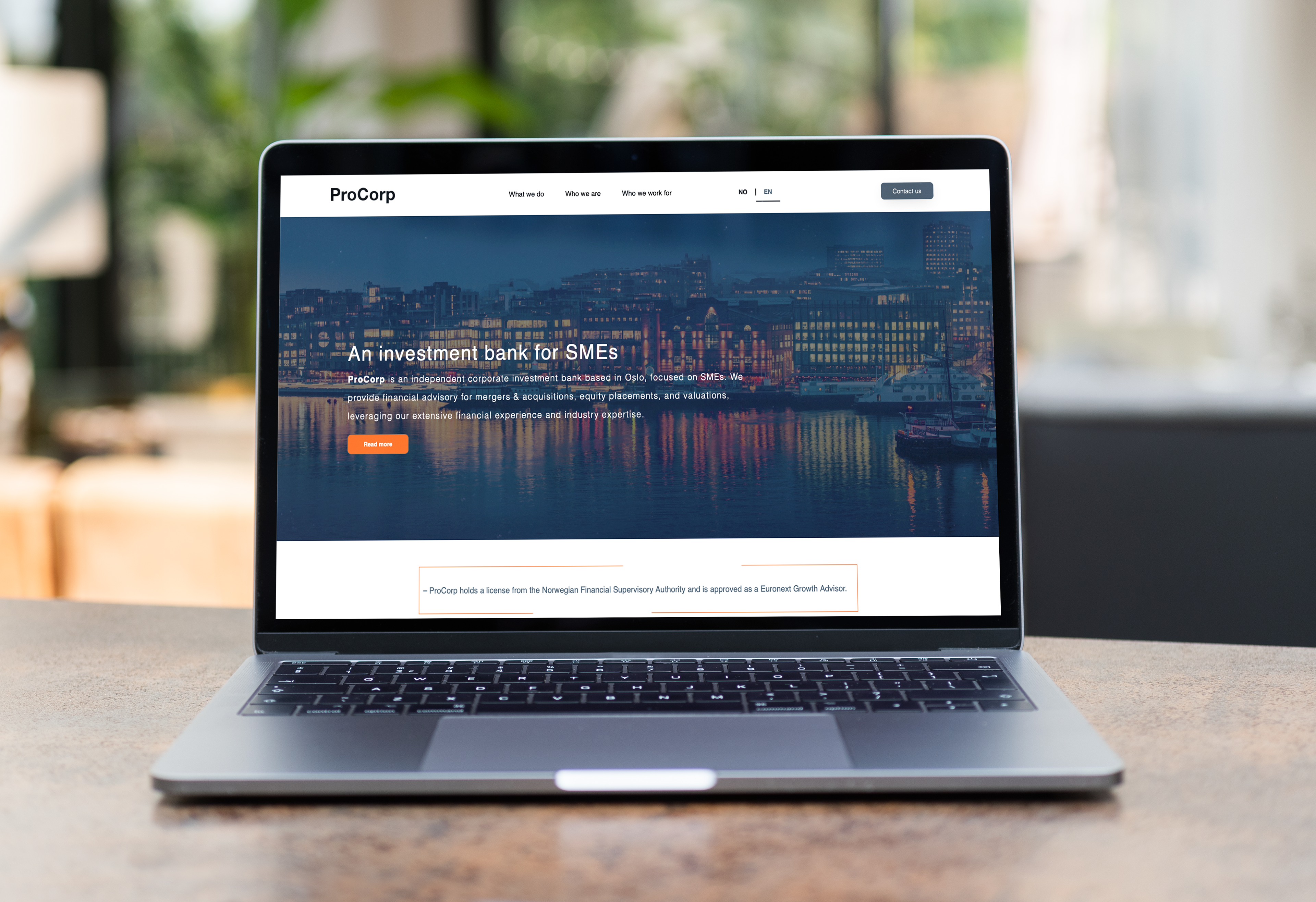 For ProCorp AS, we have designed a new website and new logo. The website is laser-focused on ProCorp's investment banking offerings in the Norwegian SME market. The logo is extremely minimalistic, with a Helvetica Neue-derived wordmark.
